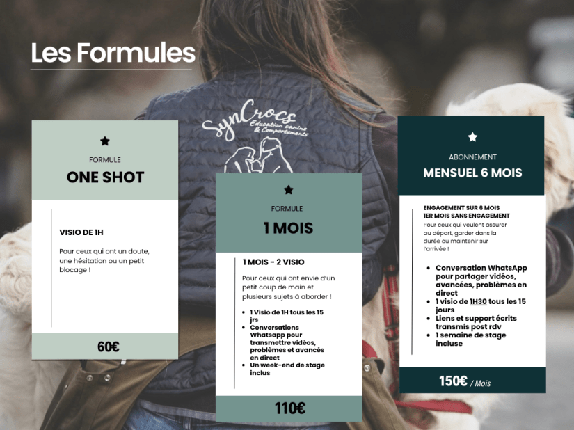 Forte de mes expériences personnelles en création d’entreprise, de multiples expériences en organisation d’événements, forte d’une société qui fait aujourd’hui vivre totalement ou en partie plusieurs acteurs du monde canin et enfin de mon expérience de formatrice chez CynoPsy je saurais vous questionner sur les points qui permettront à votre entreprise de devenir un pilier de votre secteur.
